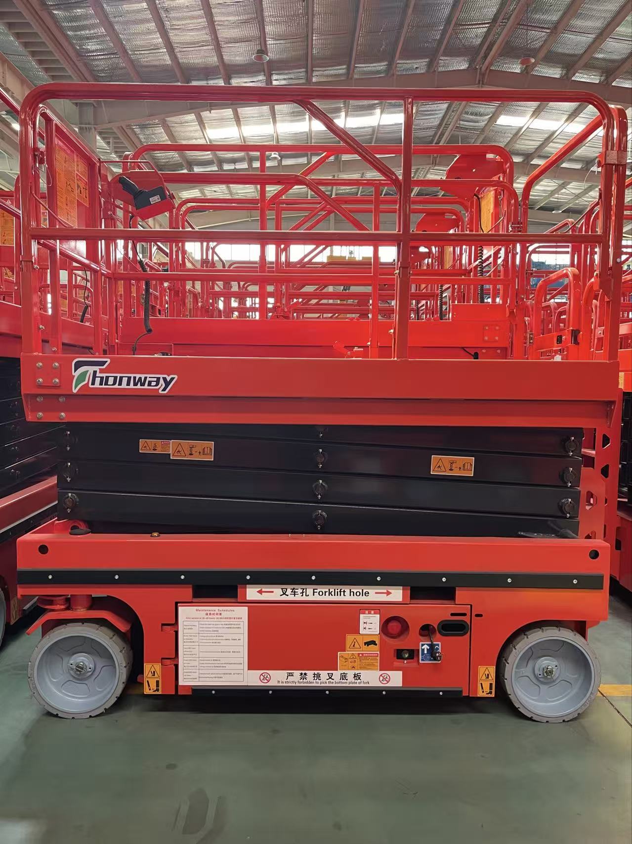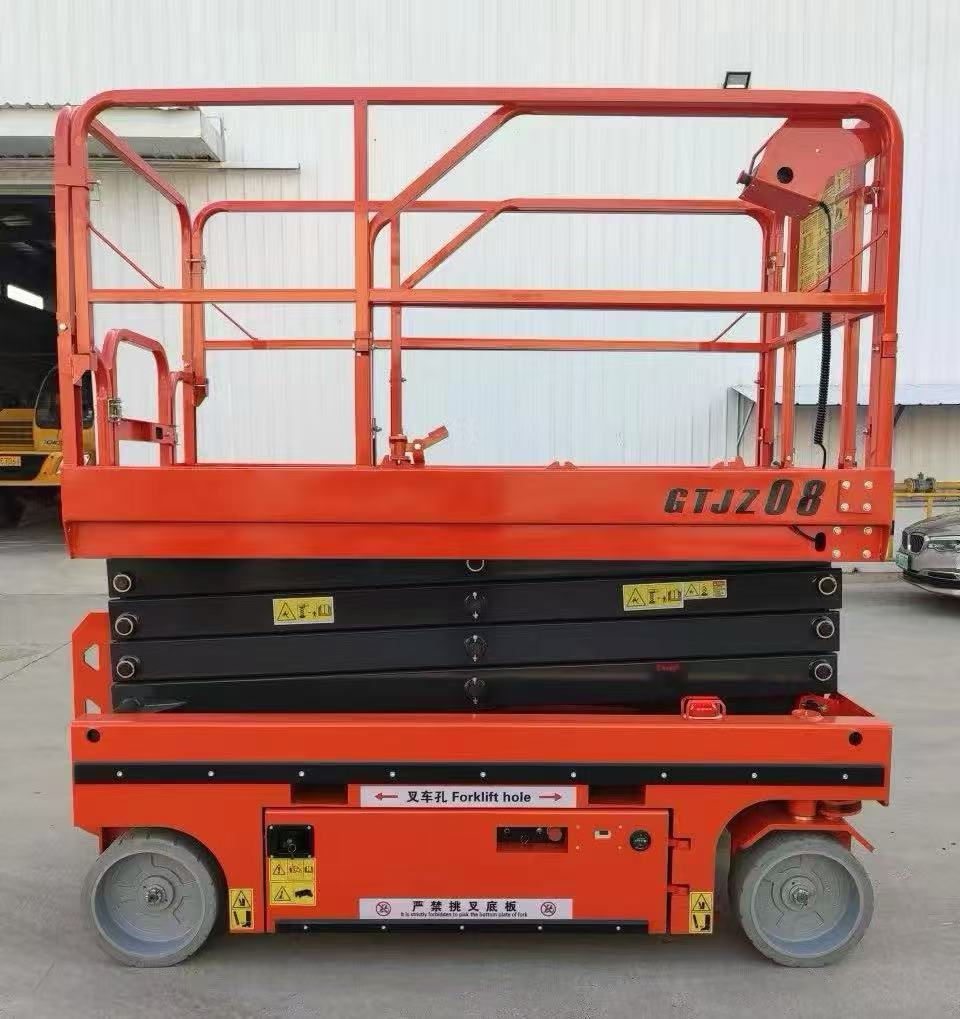 The self-propelled scissor lifting platform has an automatic walking function, and the whole machine is designed as a whole, which can operate flexibly in a small space. Built-in battery power supply, hydraulic drive and battery power combined, strong power, low noise, to meet different working states, no need for external power supply, no need for external traction can be lifted and lowered freely, the operator only needs to master the equipment control handle to complete the equipment forward, backward, steering, fast, slow walking and lifting and other actions. This equipment is flexible in movement, easy to operate, labor-saving, labor-saving to make high-altitude work more convenient and fast, is the ideal aerial work platform for efficient and safe production of modern enterprises, the tires are polyurethane non-marking tires, which are not easy to scratch the floor when used in high-end shopping malls. The battery is a lead-acid maintenance-free battery, with a large capacity to increase the use time of the equipment, strong power and strong endurance. The equipment is made of high-quality thickened steel to increase the support strength of the equipment, and comes with an overload protection system, tilt protection system, and pothole protection system, making the equipment safer and more reliable during use. The equipment is equipped with an upper and lower control system, and the upper control can operate the equipment to lift, walk, and steer. People can also operate the equipment to lift while standing on the ground. The equipment is also equipped with maintenance support to increase safety protection during maintenance. The paint surface adopts electrophoresis technology, and the coating of electrophoretic paint can make the inner cavity, weld, edge of the workpiece and other weak parts of the traditional coating method can also get good coating protection, so that the overall corrosion resistance of the product is significantly improved, and it is not easy to fade for a long time, which can greatly extend the service life of the product and improve the product grade.